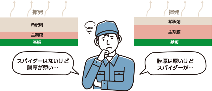 ここに、現場でよくあるジレンマがあります。 「コーティング後の膜厚を厚くしたい」ため、なるべく主剤を濃くしたいが、主剤を濃くするとスパイダー現象が発生しやすくなるというジレンマです。
