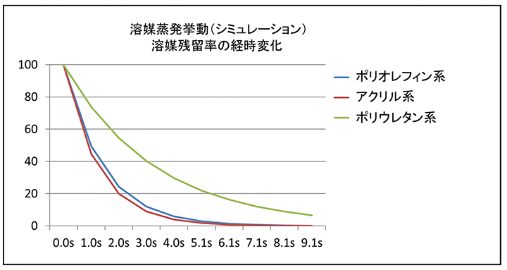 ポリオレフィン・アクリル樹脂系は、溶剤との親和性がそれほど高くなく、溶剤が蒸発すると一気に粘度が上昇します。また、比較的低分子量または線状構造のものが多く、ガラス転移温度(Tg)が高めで、揮発性溶剤が蒸発すると比較的早く固体状態に移行しやすい傾向があります。