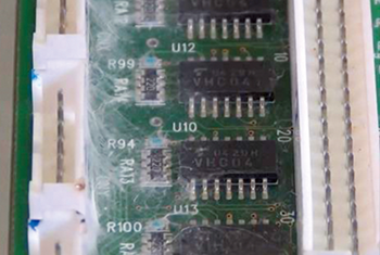 塗布環境の温度や湿度も影響を及ぼします。基板防湿コーティング剤に含まれる溶剤(特に有機溶媒系)は、温度が高く湿度が低いと揮発スピードが大幅に上昇します。 スプレー後、液が部品表面に到達する前に部分的に乾き始めることで、糸状に残った液が途中で固化し、そのまま蜘蛛の巣状に固着するリスクが高まります。