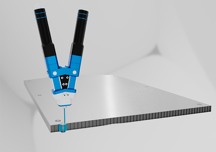 航空機構造部材の強度確保と軽量化のため、ハニカム構造などの中空パネル内に2液性接着剤を充填するインサート工程が求められていました。しかし、従来のプロセスでは以下のような課題がありました: