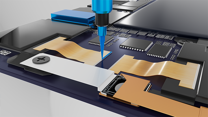 スマートフォンやタブレットなどの小型電子機器では、フレキシブル基板(FPC)への高精度な液剤塗布が求められます。これらの基板はデバイスの小型化に伴い、回路間のスペースが極めて狭く、高密度な実装構造を持っているため、従来の装置では以下のような課題が発生していました。