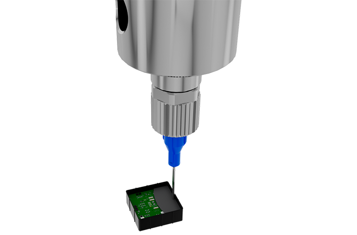 0.001ccレベルの微量吐出が可能で、エポキシ系封止材でも安定した塗布を実現します。狭小スペースでの過剰塗布を防ぎ、必要箇所に必要量のみを正確に塗布することで、材料コスト削減と信頼性向上に貢献します。