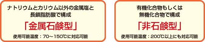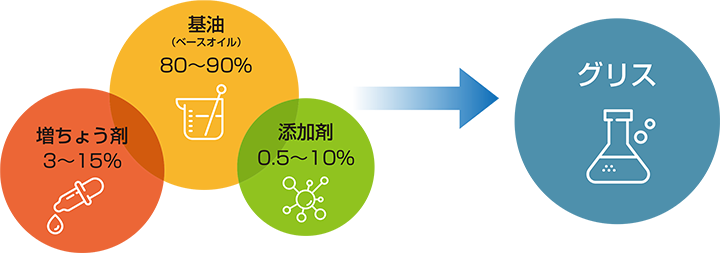 全体の3〜15%を占めている成分で、以下の2種類に分けられます。 製造方法と添加されている増ちょう剤の種類、使用可能な温度帯に違いがあります。