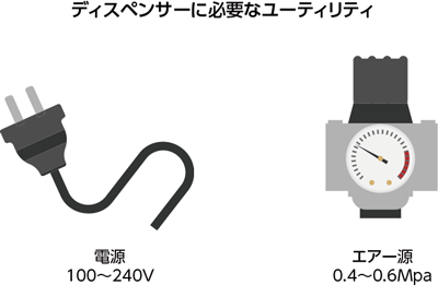 産業用途でディスペンサーを導入するには、まずユーティリティの確認が必要です。前述のようにディスペンサーでの塗布には、エアーと電気が必要になります。ディスペンサーの種類や必要な吐出形状によって変わりますが、準備すべきユーティリティとしては、電気(100~240V)、エアー(0.4~0.6Mpa程度)が一般的です。