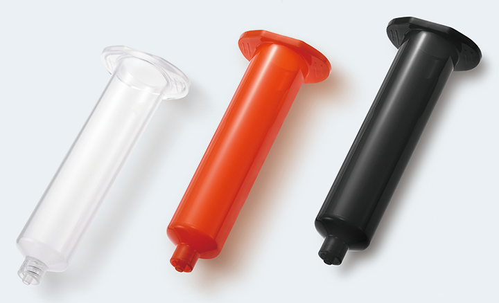 産業用ディスペンサーにおける「シリンジ」とは、液剤を一時的に貯蔵し、そこから直接液体の塗布を行う又は、定量供給装置(バルブやポンプ)へと安定的に供給する容器です。
