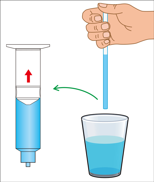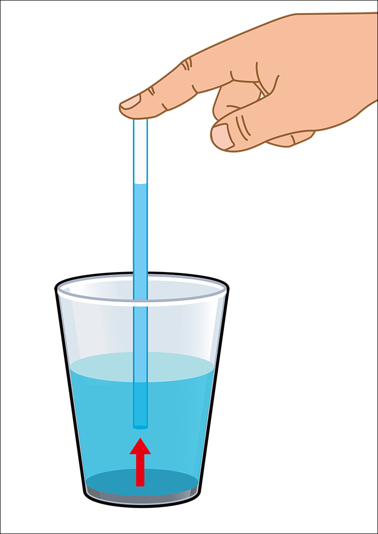 ストローの上端を指で密閉したまま引き上げると中の水が落ちずに保持されます。