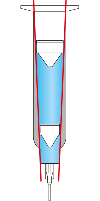 成形工程では抜きテーパーとしてシリンジの内壁にテーパーがかかっているものがあります。このような形状だと、シリンジ上部ではピストンとの密着性が弱く、シリンジ下部にピストンが移動するにつれてだんだんとキツクなっていきます。