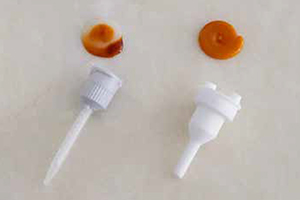 同じ容積流量および同じ環境条件にて、スタティックミキサーとダイナミックミキサーを使用して混合した結果を比較: 同じ制御装置(同じキャリブレーションとプログラム)と同じポンプ(ドライバー、ポンプハウジング、ローターとステーター等)で実験し、混合方式により差異を確認。 材料は、取り扱いの難しい、2液性エポキシ接着剤を、混合比は重量で10:1(A:B)で、吐出速度(0.5 ml / min〜6 ml / min)を変えて確認。図1に示すように、スタティックミキサーを使用したテスト材料は、部分的のみで完全硬化できませんでした。